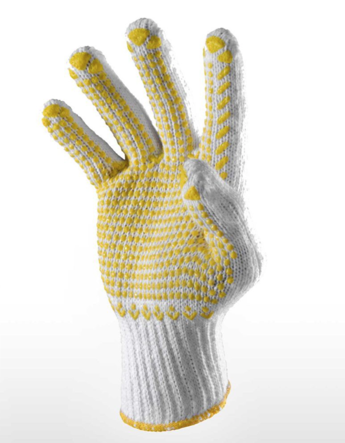 Cut resistant hand gloves made from knitted material with PVC Dots for improved grip and reinforced thumb crotch